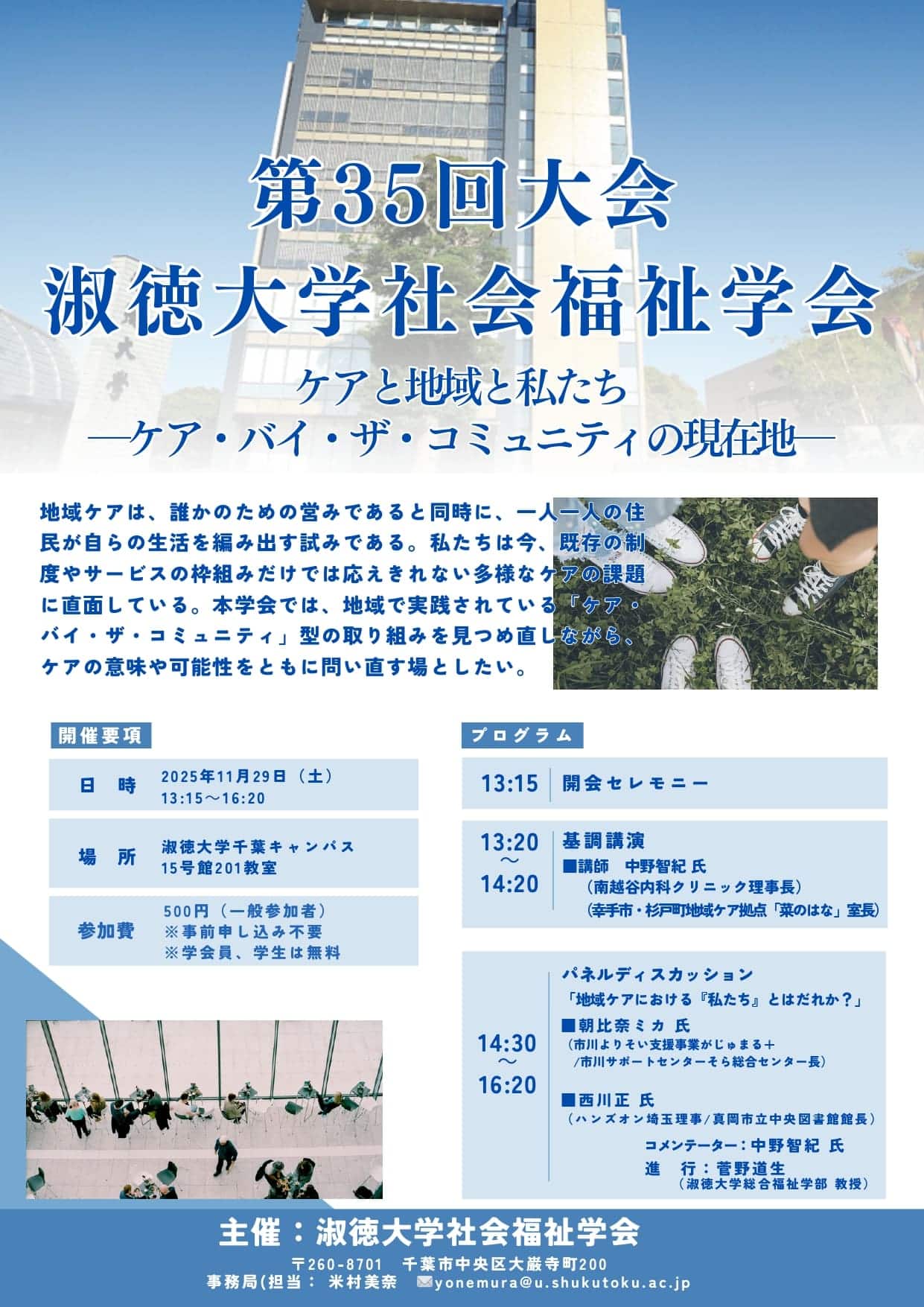 淑徳大学 社会福祉学会では、令和7年11月29日(土)、「第35回大会淑徳大学社会福祉学会」を開催いたします。